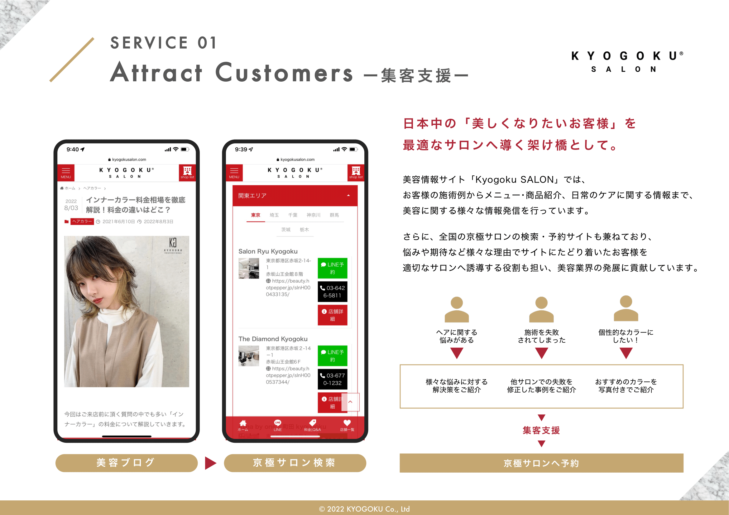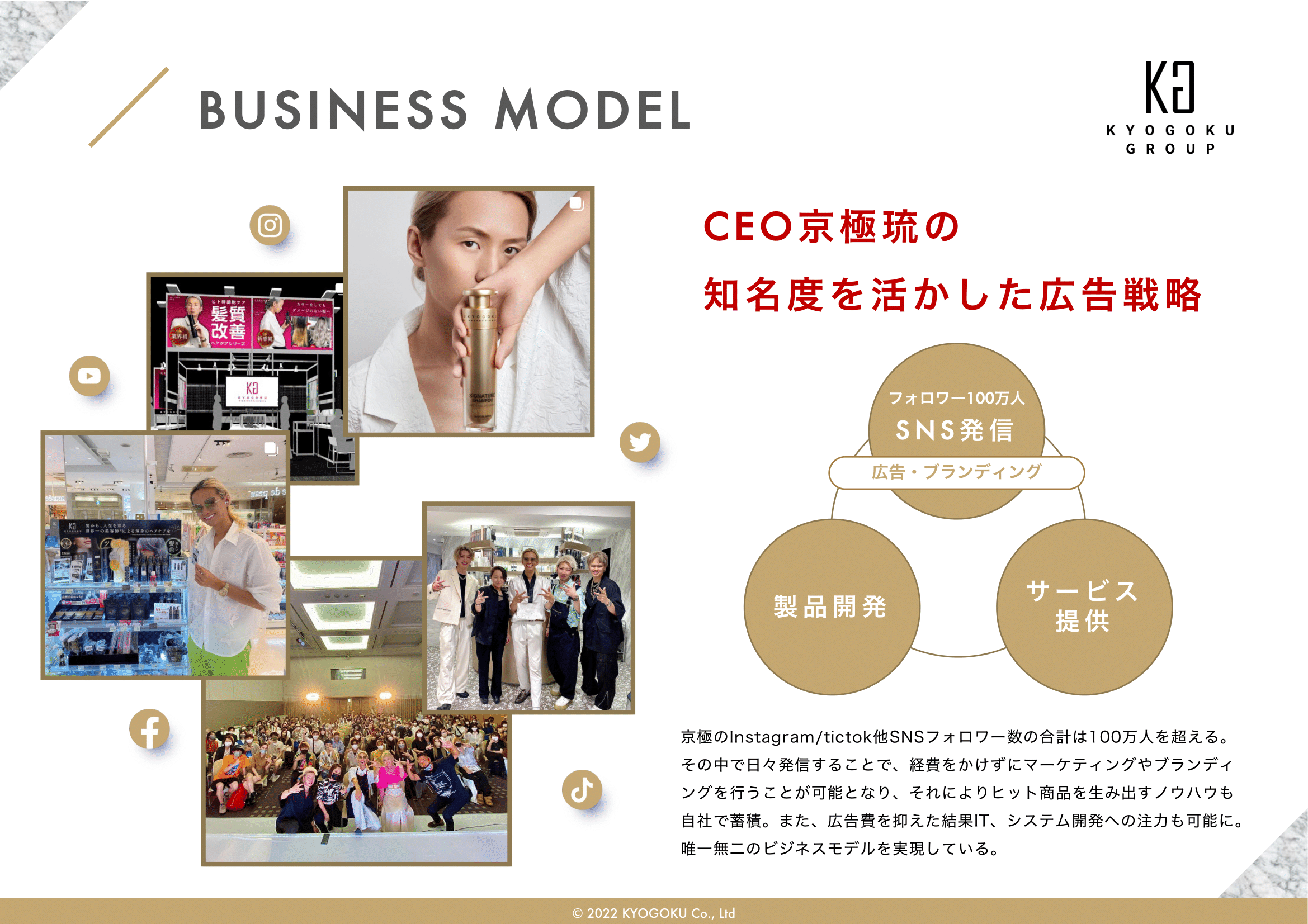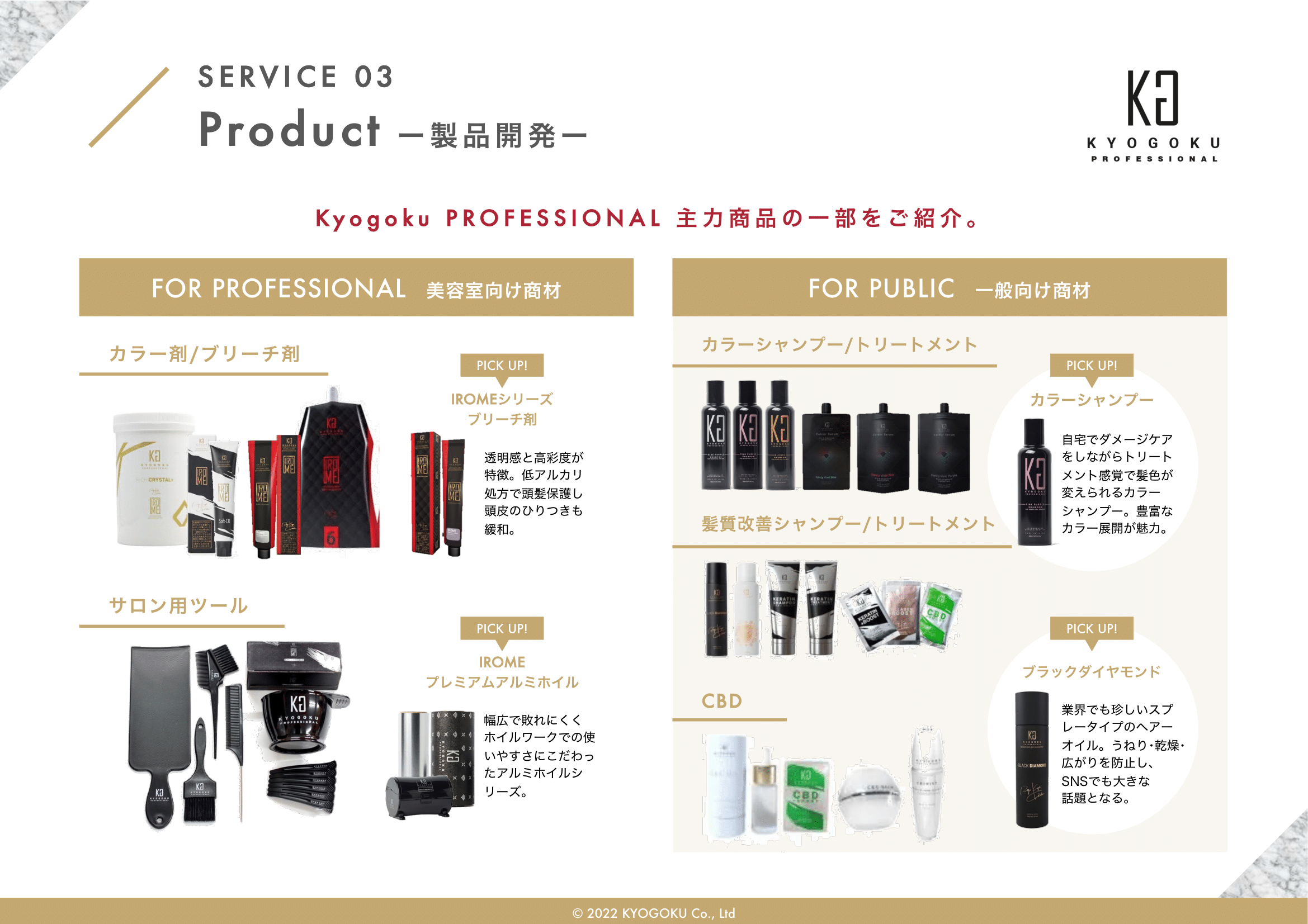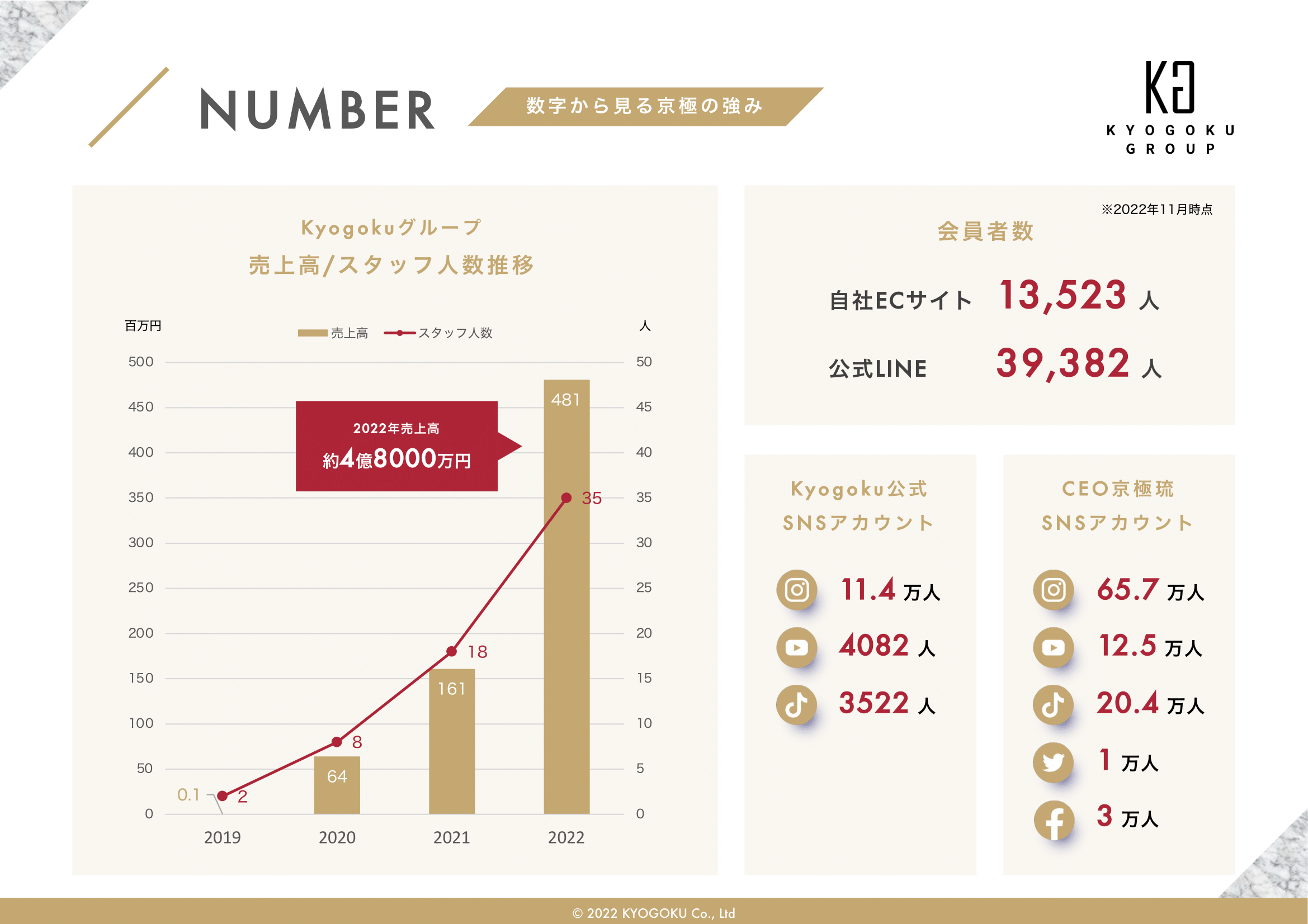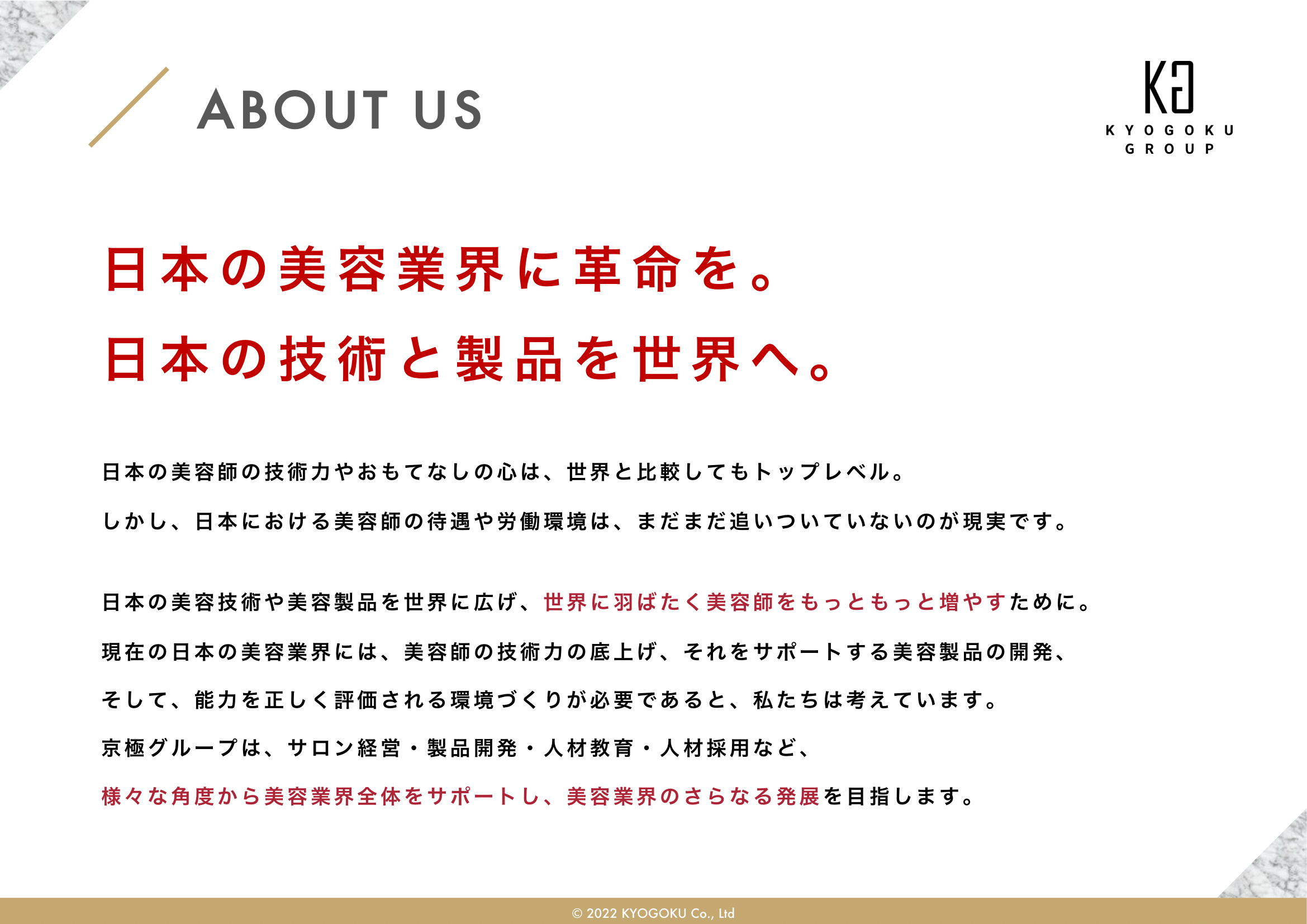 会社概要 会社概要2022年 PDF 社名 株式会社Kyogoku 法人番号 6030001151222 所在地 〒340-0034 埼玉県草加市氷川町2152番地1 設立 2020年11月5日 資本金 500万円 代表者 田中美穂 従業員数 43名(業務委託契約含め) 事業概要 ヘアカラー剤、ヘアスタイリング剤、シャンプー、ヘアトリートメント、 薬用発毛促進剤、スキンケア・メイクアップ化粧品の製造および販売(国内・輸出) オンラインアカデミー運営