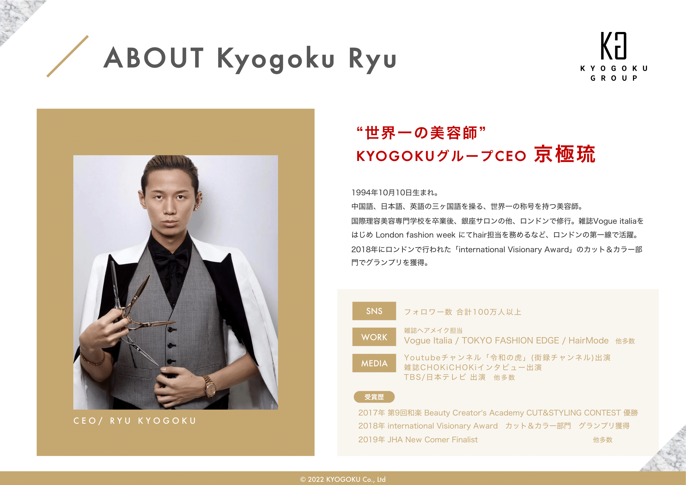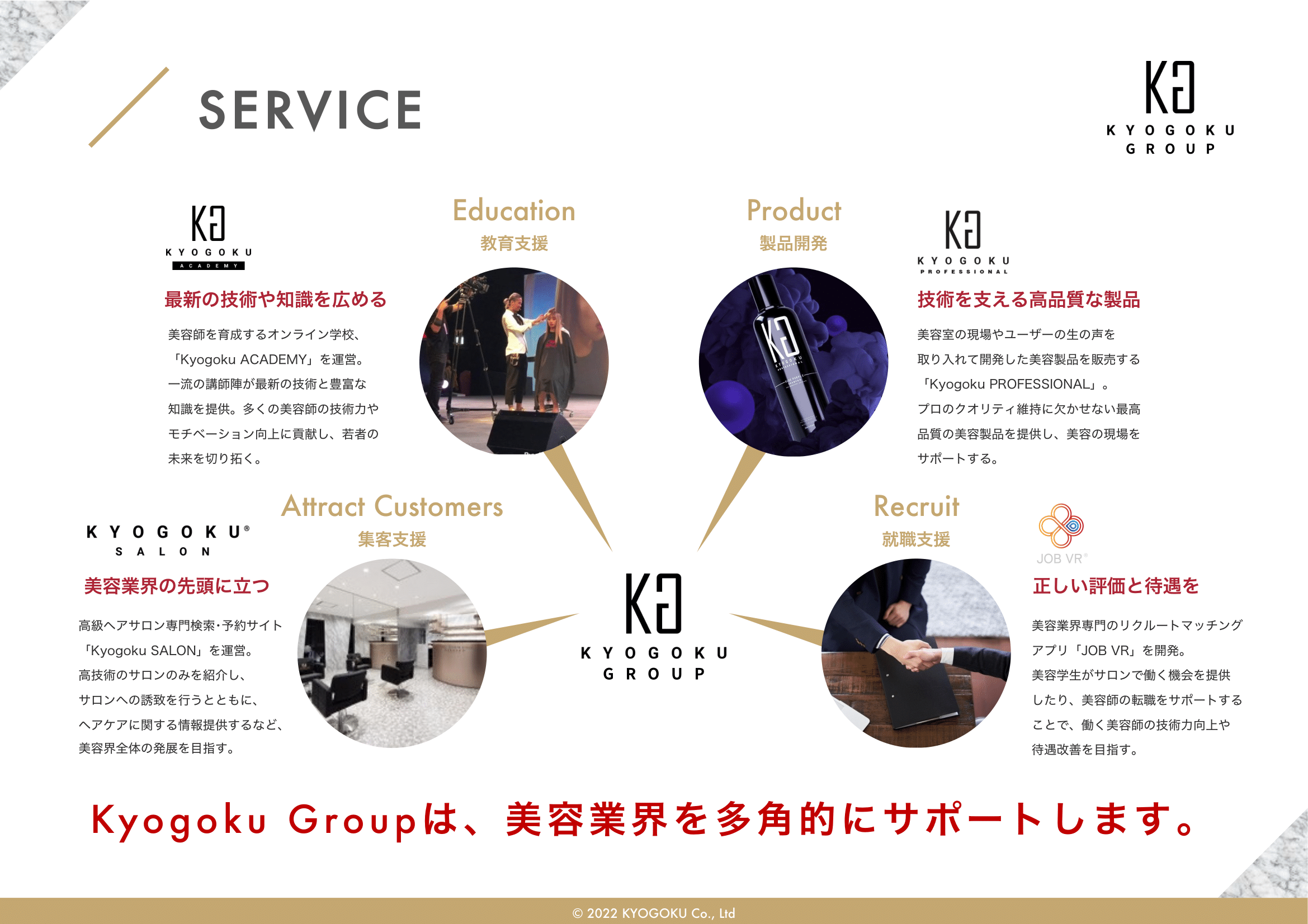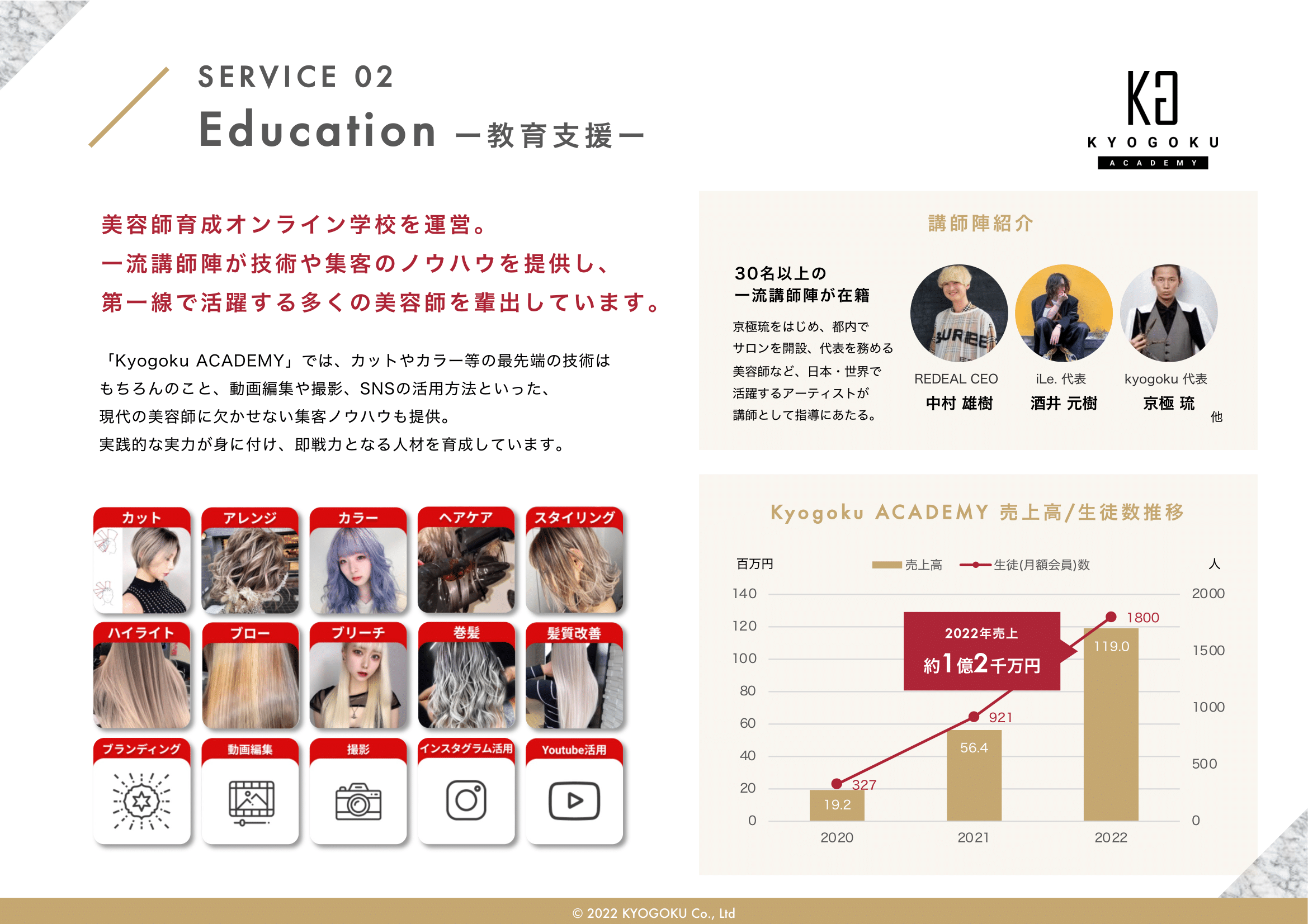 会社概要 会社概要2022年 PDF 社名 株式会社Kyogoku 法人番号 6030001151222 所在地 〒340-0034 埼玉県草加市氷川町2152番地1 設立 2020年11月5日 資本金 500万円 代表者 田中美穂 従業員数 43名(業務委託契約含め) 事業概要 ヘアカラー剤、ヘアスタイリング剤、シャンプー、ヘアトリートメント、 薬用発毛促進剤、スキンケア・メイクアップ化粧品の製造および販売(国内・輸出) オンラインアカデミー運営